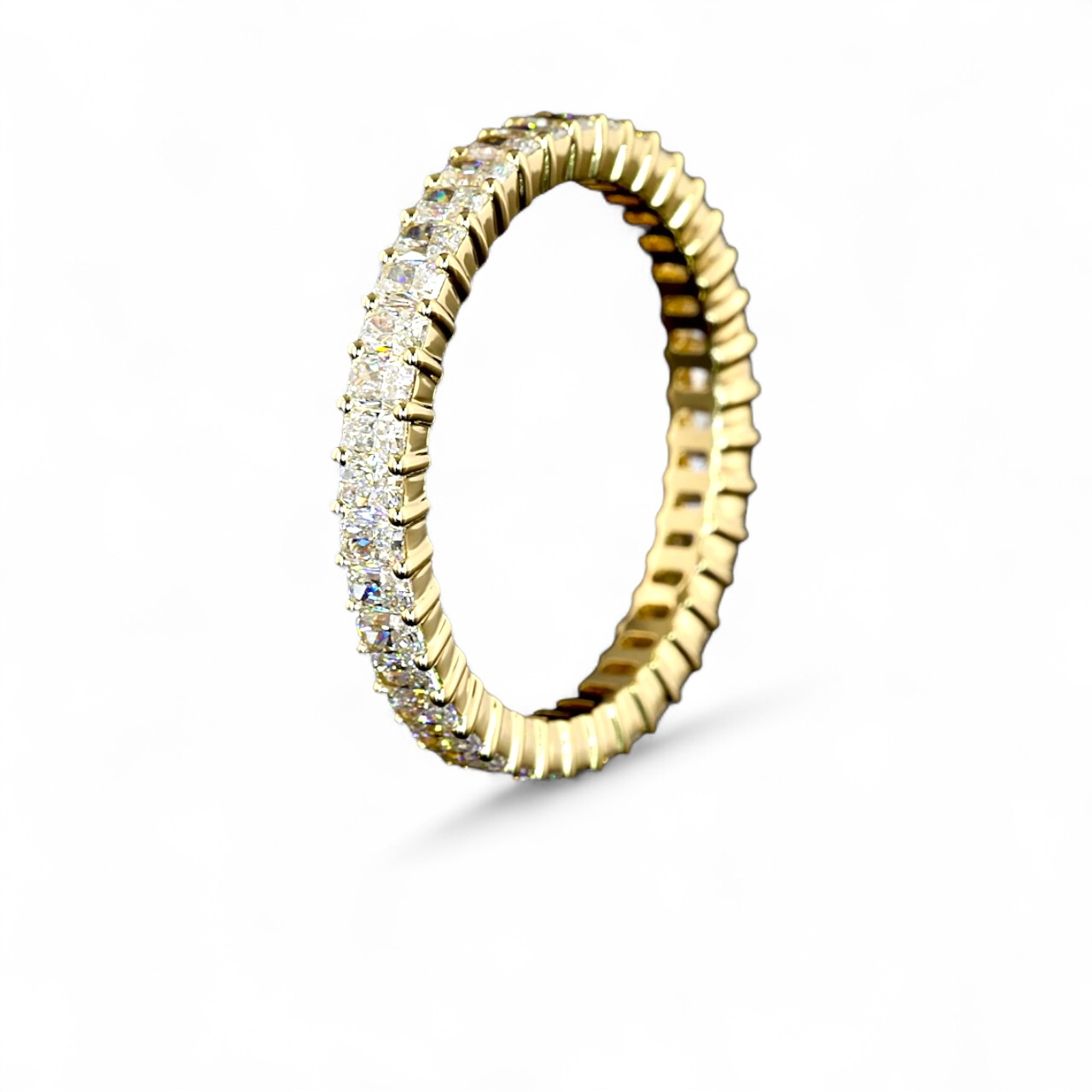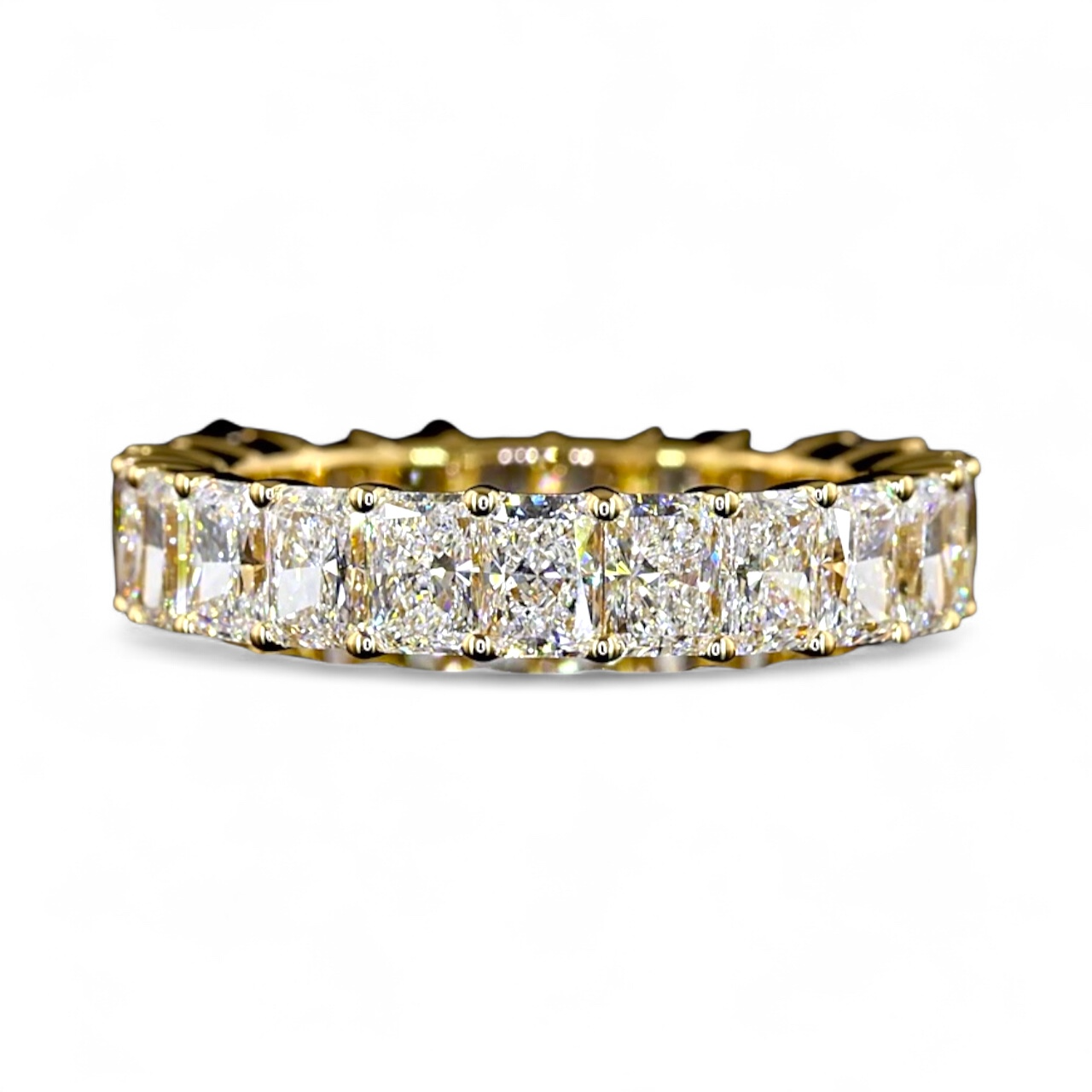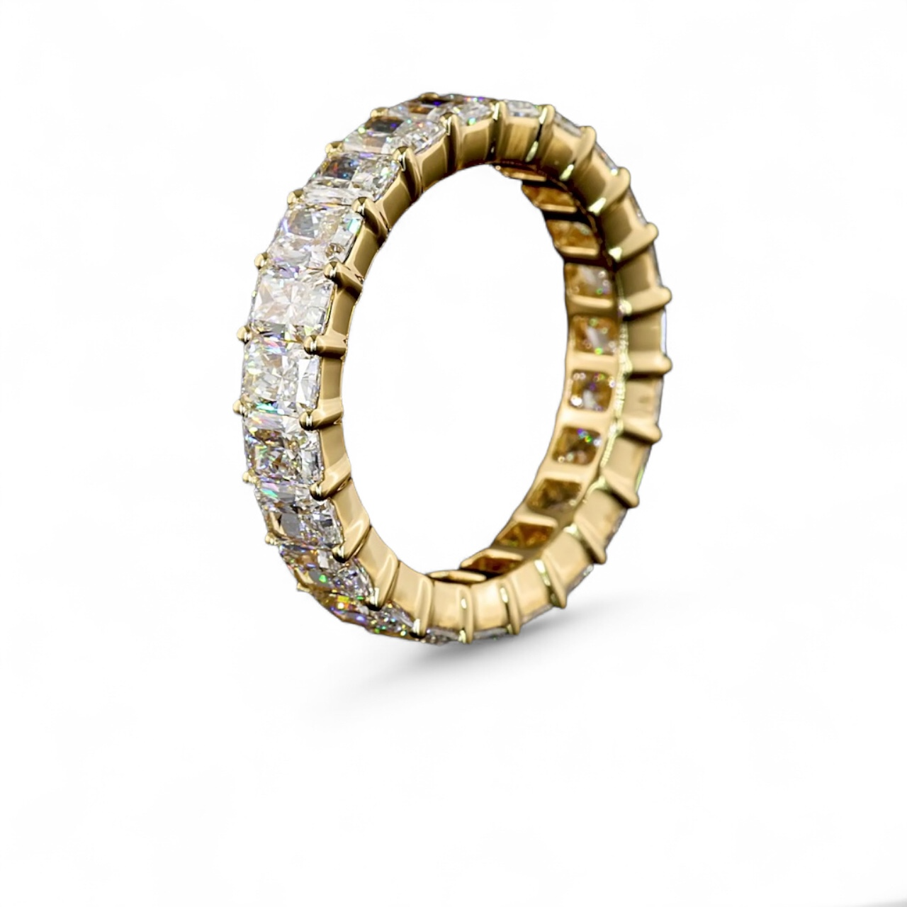 The Meridian Eternity Band is a magnificent symbol of luxury and achievement, featuring a substantial 3.9 Carat total weight of brilliant Radiant Shape diamonds. Handcrafted in rich, opulent 18K YELLOW...