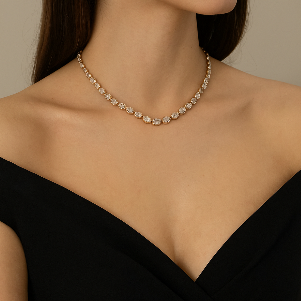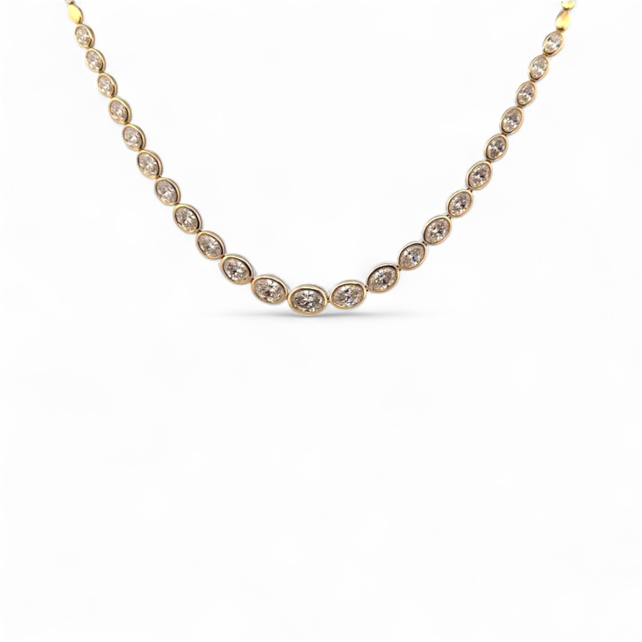 The Golden Aura Oval Diamond Necklace showcases a row of bezel-set oval diamonds in a radiant yellow gold setting. With its timeless design and luxurious sparkle, this necklace is the...