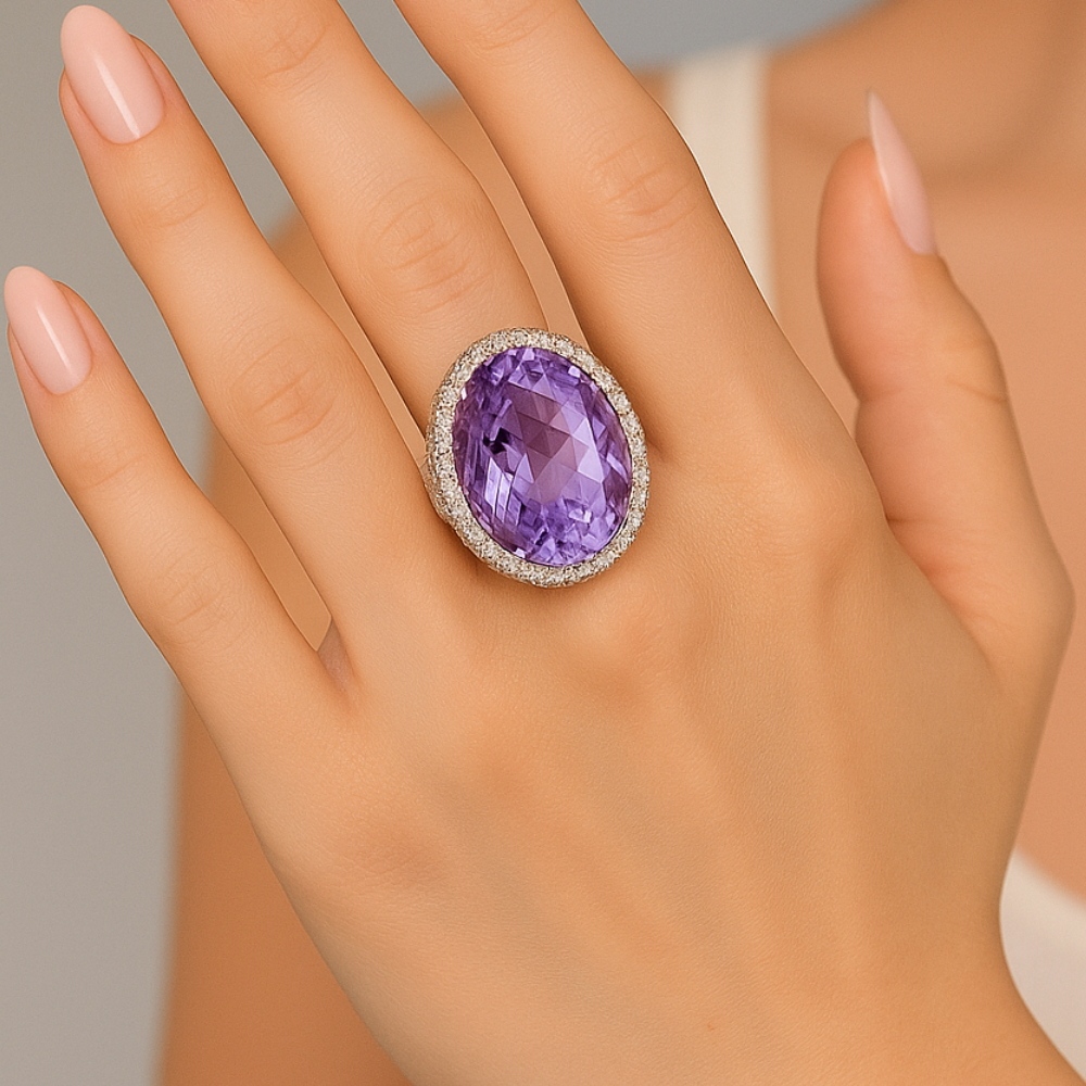 A stunning oval amethyst with a halo of diamonds, radiating elegance and timeless luxury.