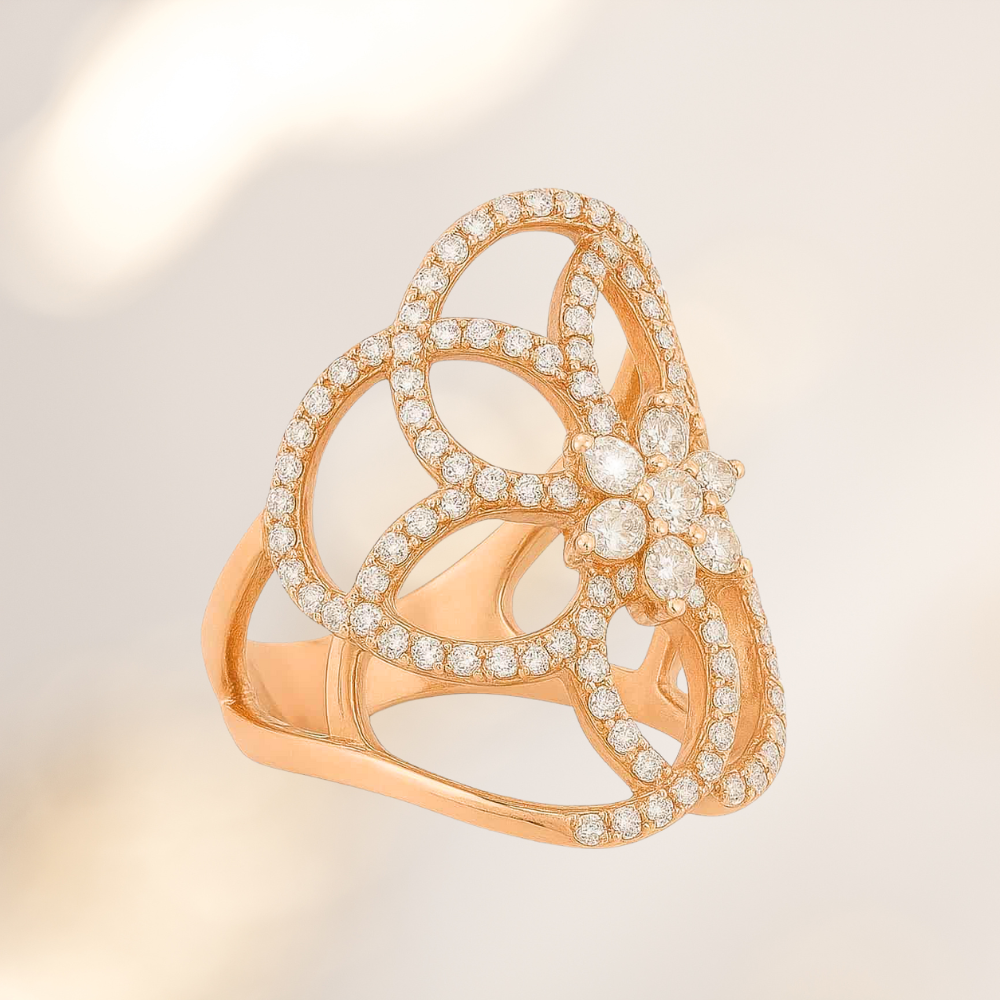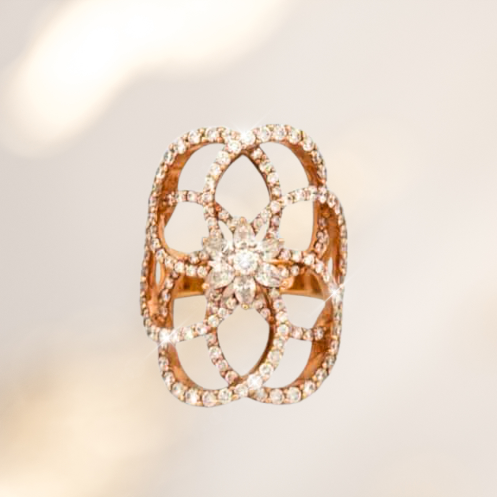 A rose gold lattice ring adorned with marquise and round diamonds, bold and timelessly elegant