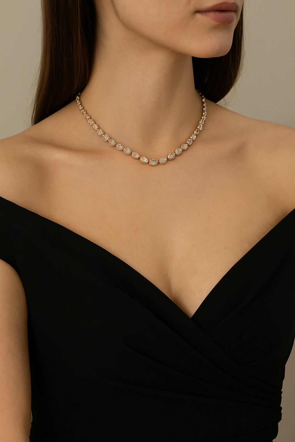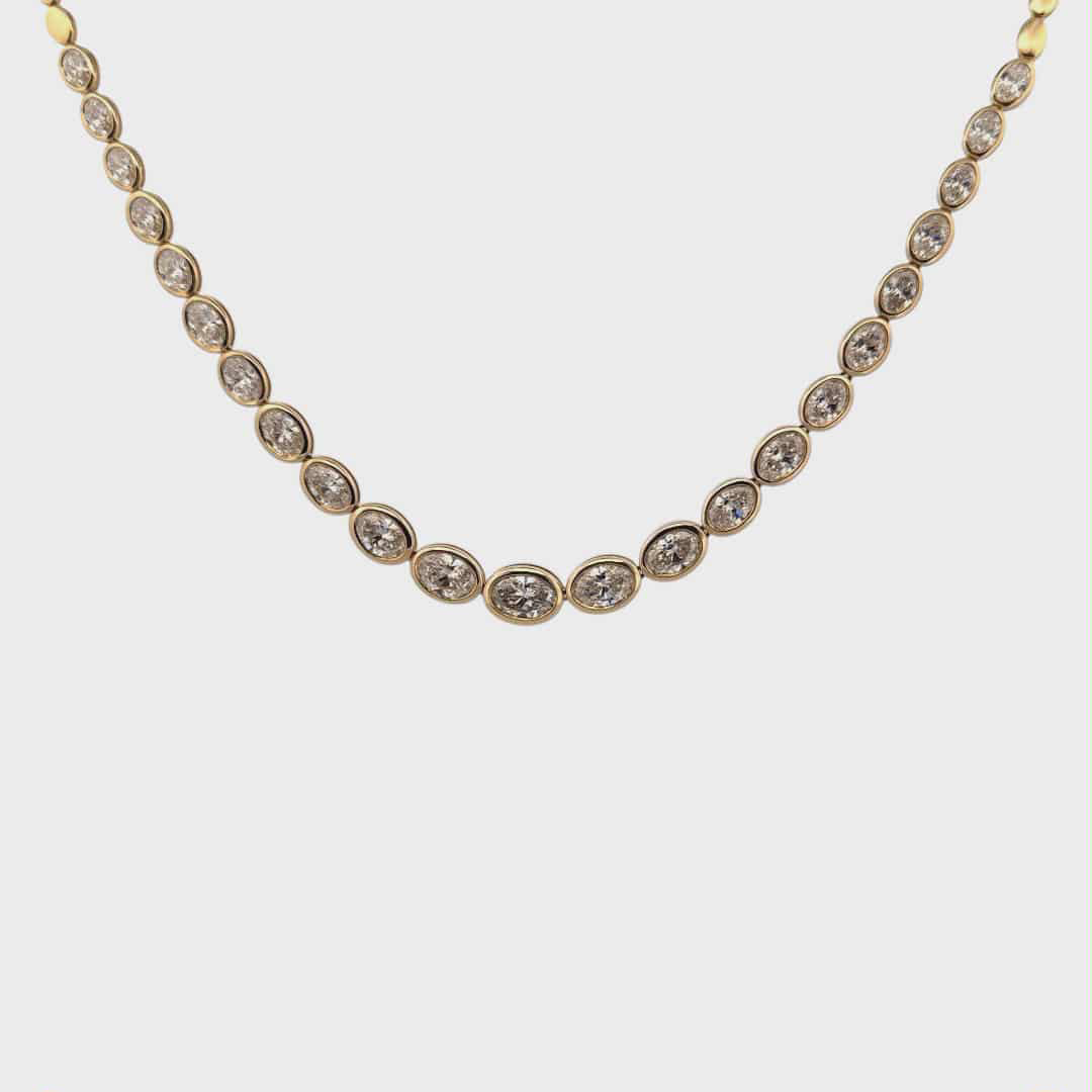 The Golden Aura Oval Diamond Necklace showcases a row of bezel-set oval diamonds in a radiant yellow gold setting. With its timeless design and luxurious sparkle, this necklace is the perfect statement piece for weddings, galas, and elegant evenings.