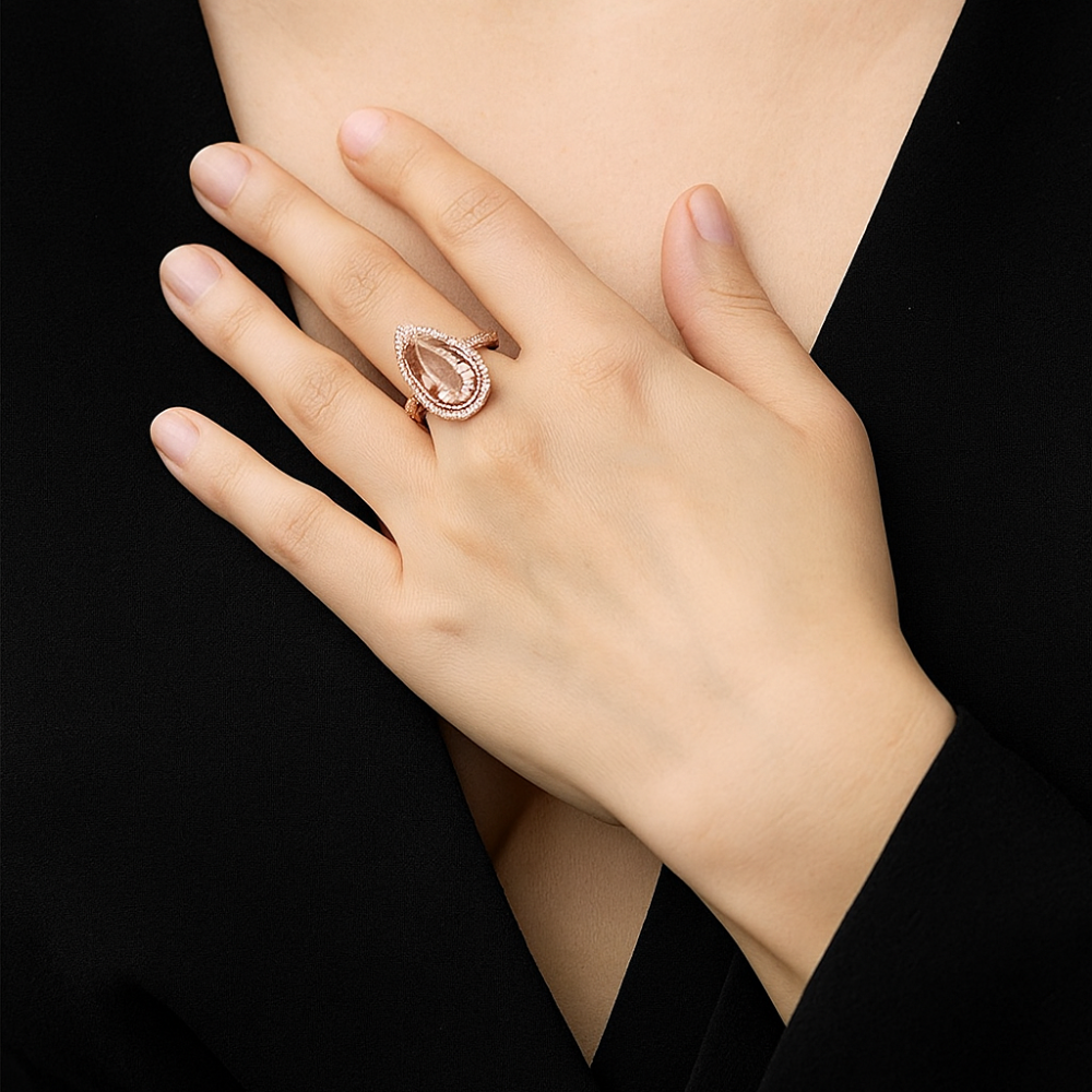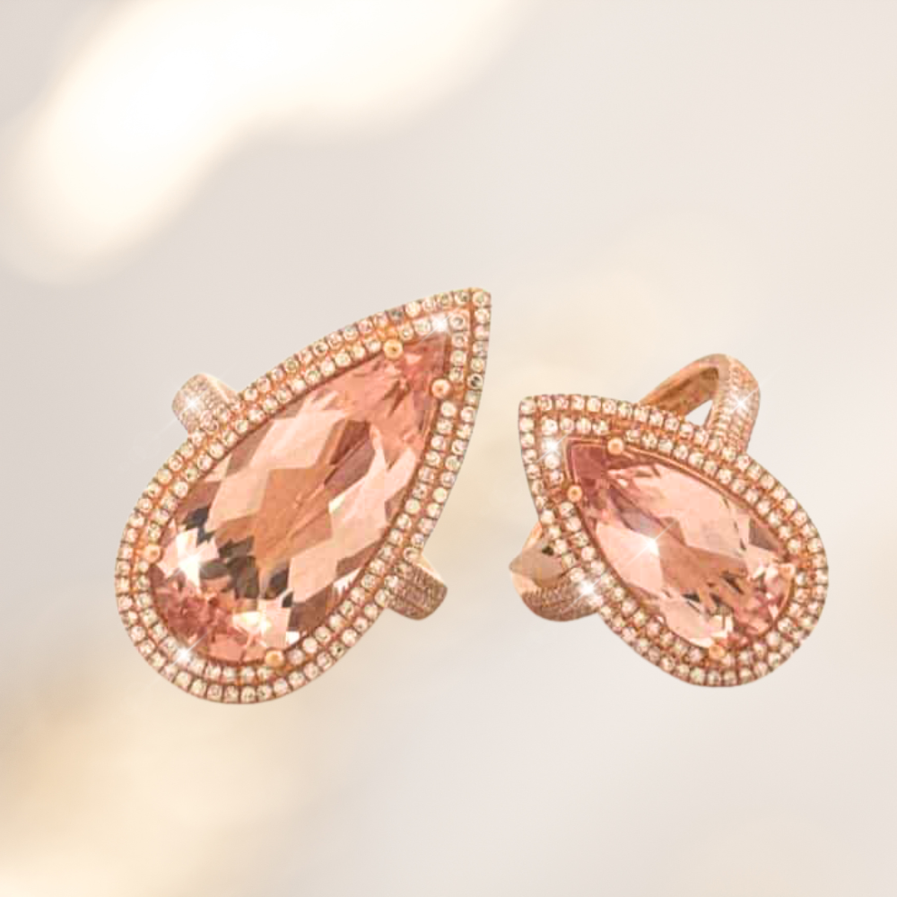 The Rose Gold Pear Cut Ring – Small features a stunning pear-shaped morganite embraced by a radiant diamond double halo. Set in warm rose gold, it exudes soft blush tones and enduring elegance. This romantic piece is designed to captivate, adding a graceful touch to any occasion.