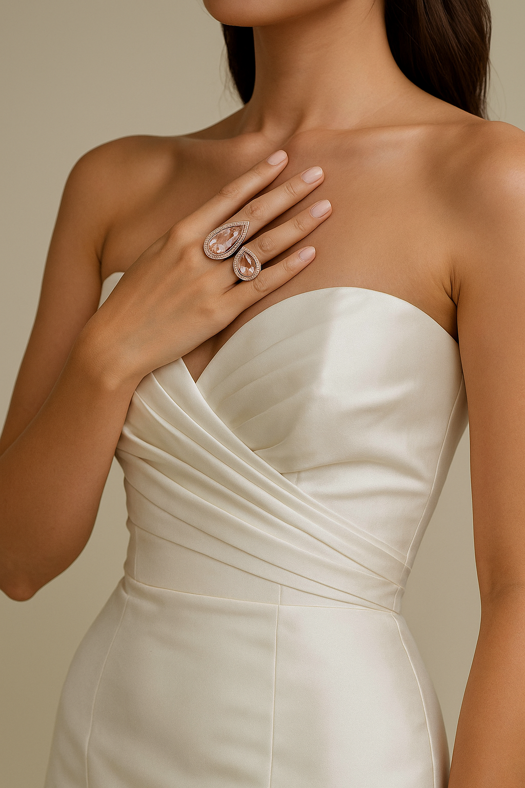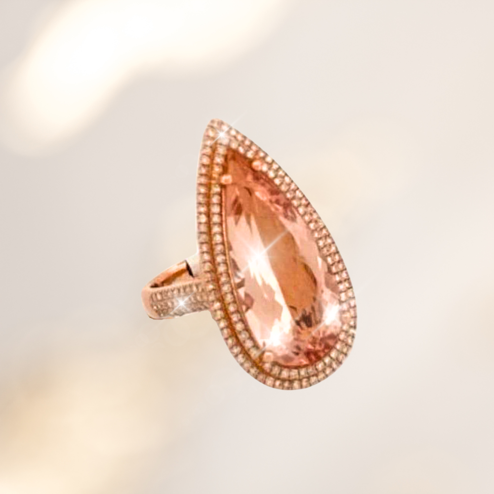 A pear-cut morganite ring set in rose gold and adorned with pavé diamonds. A romantic statement piece, perfect for weddings or evening glamour.
