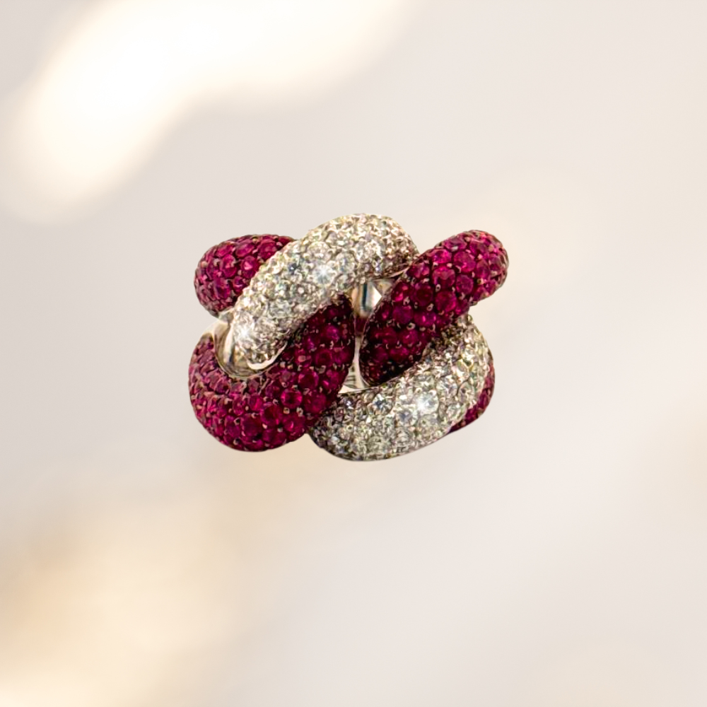 Make a bold statement with this white gold knot cocktail ring, adorned with vibrant pavé-set rubies and sparkling diamonds. Its intertwined design symbolizes unity and strength, making it a striking choice for evening wear or a one-of-a-kind gift.