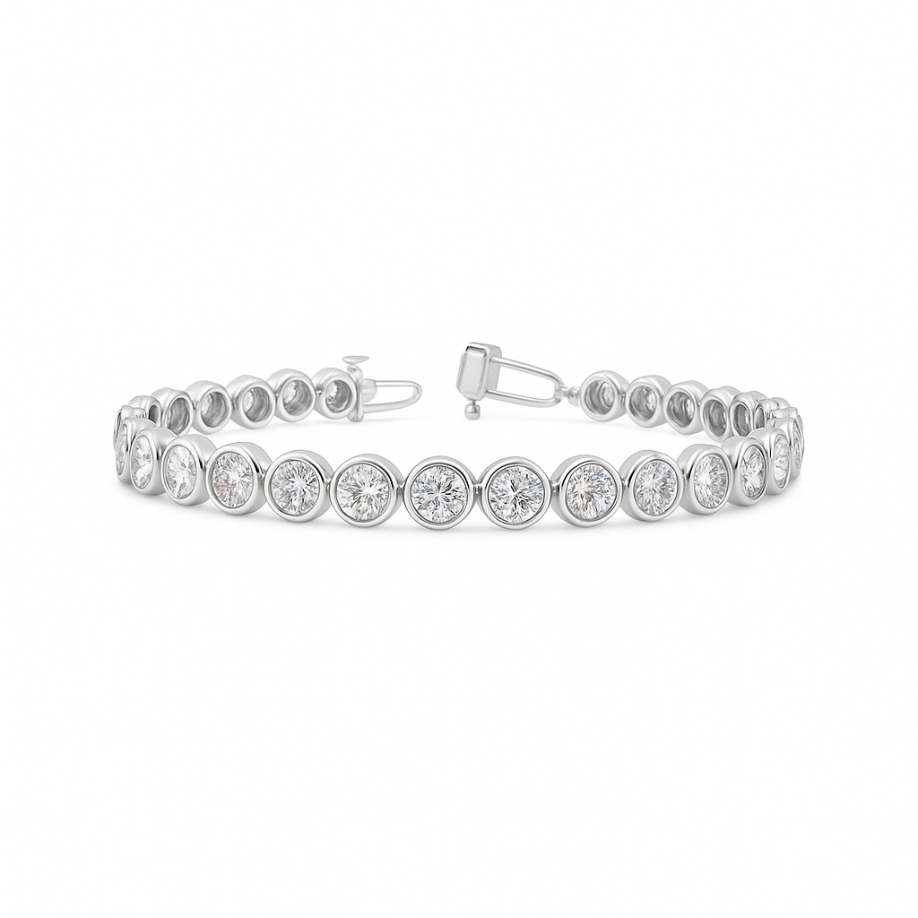 The Arctic Round Diamond Tennis Bracelet in 14K White Gold is a stunning display of cool fire and uncompromising brilliance. This spectacular Tennis/Riviera Bracelet features a substantial total of 6.76...