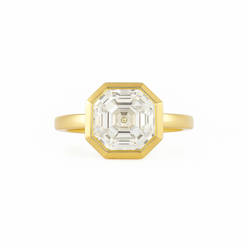 Astrid Octagon Diamond Solitaire Ring in radiant 14K Yellow Gold. This distinctive piece features a magnificent 3.33 Ct Octagon Shape Diamond, celebrated for its bold geometric precision and captivating brilliance....