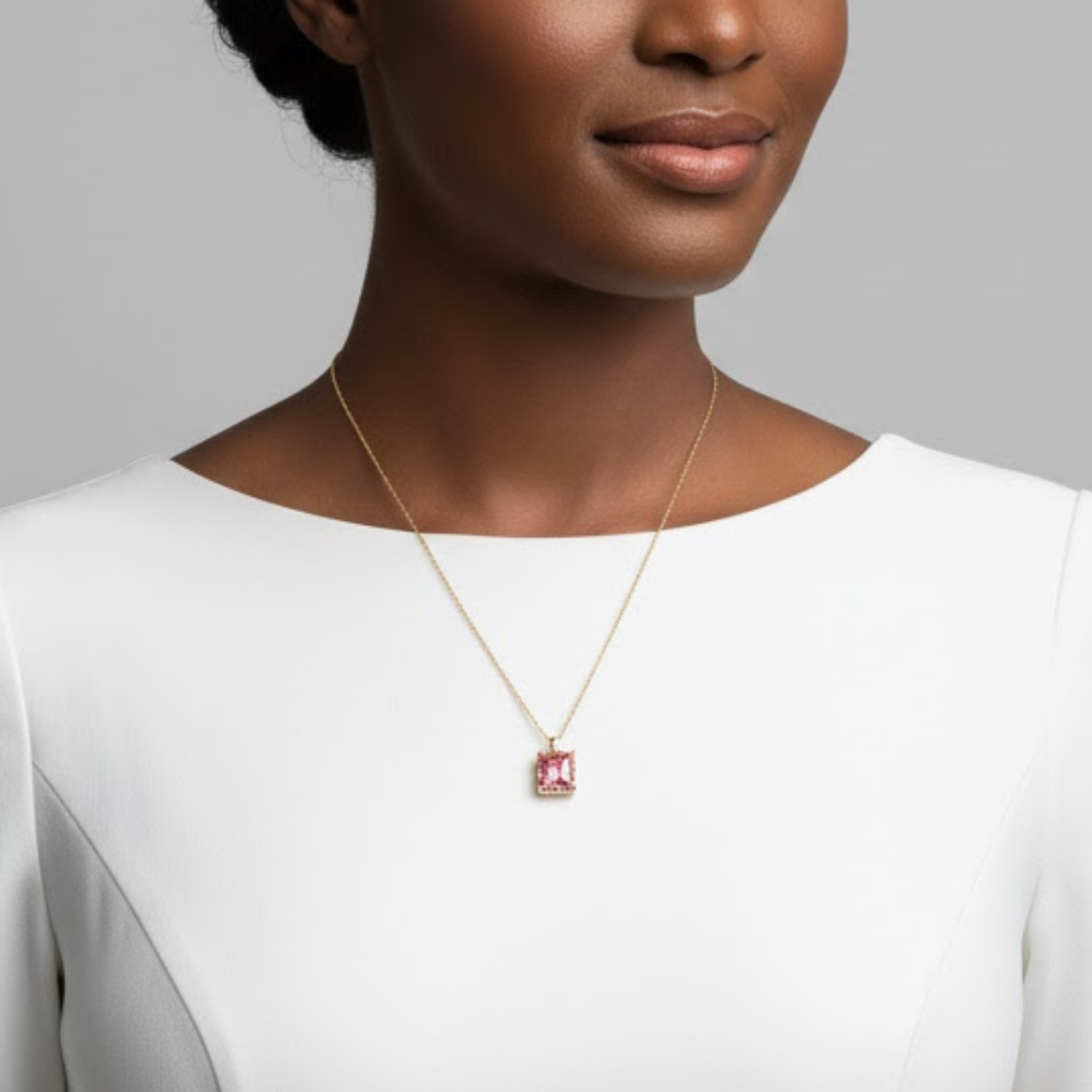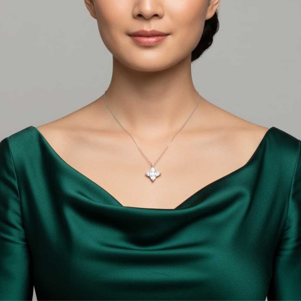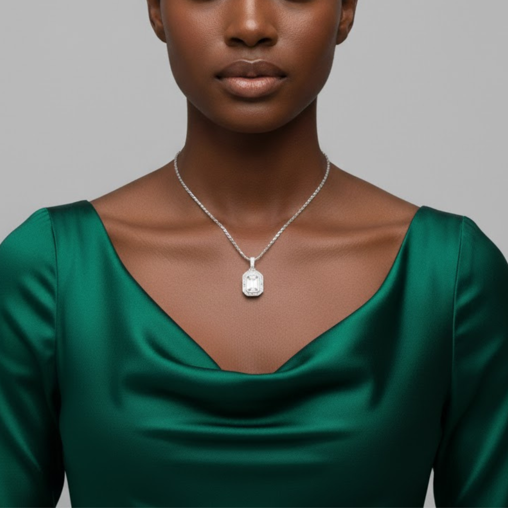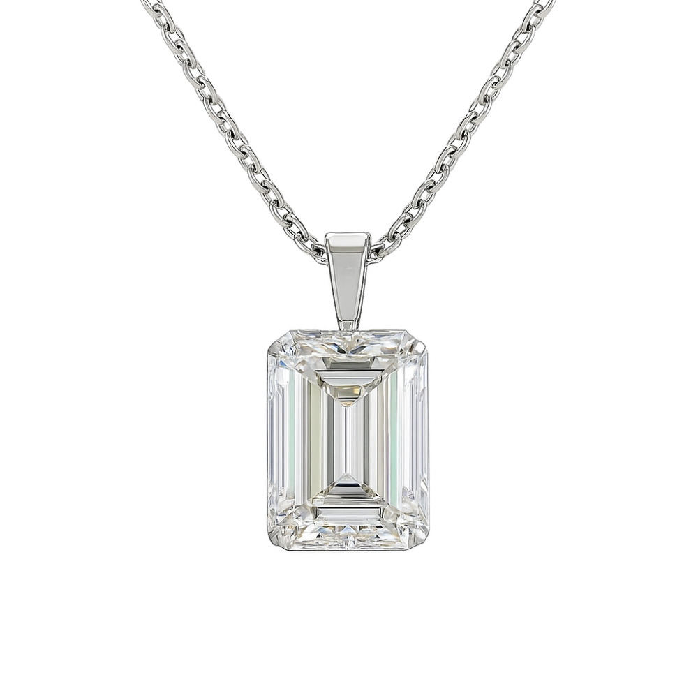 The Vera Pendant is the ultimate expression of pure truth and sophisticated luxury. This magnificent solitaire showcases a substantial 3.52 Carat Emerald Shape diamond, renowned for its sharp, clean step-cut...