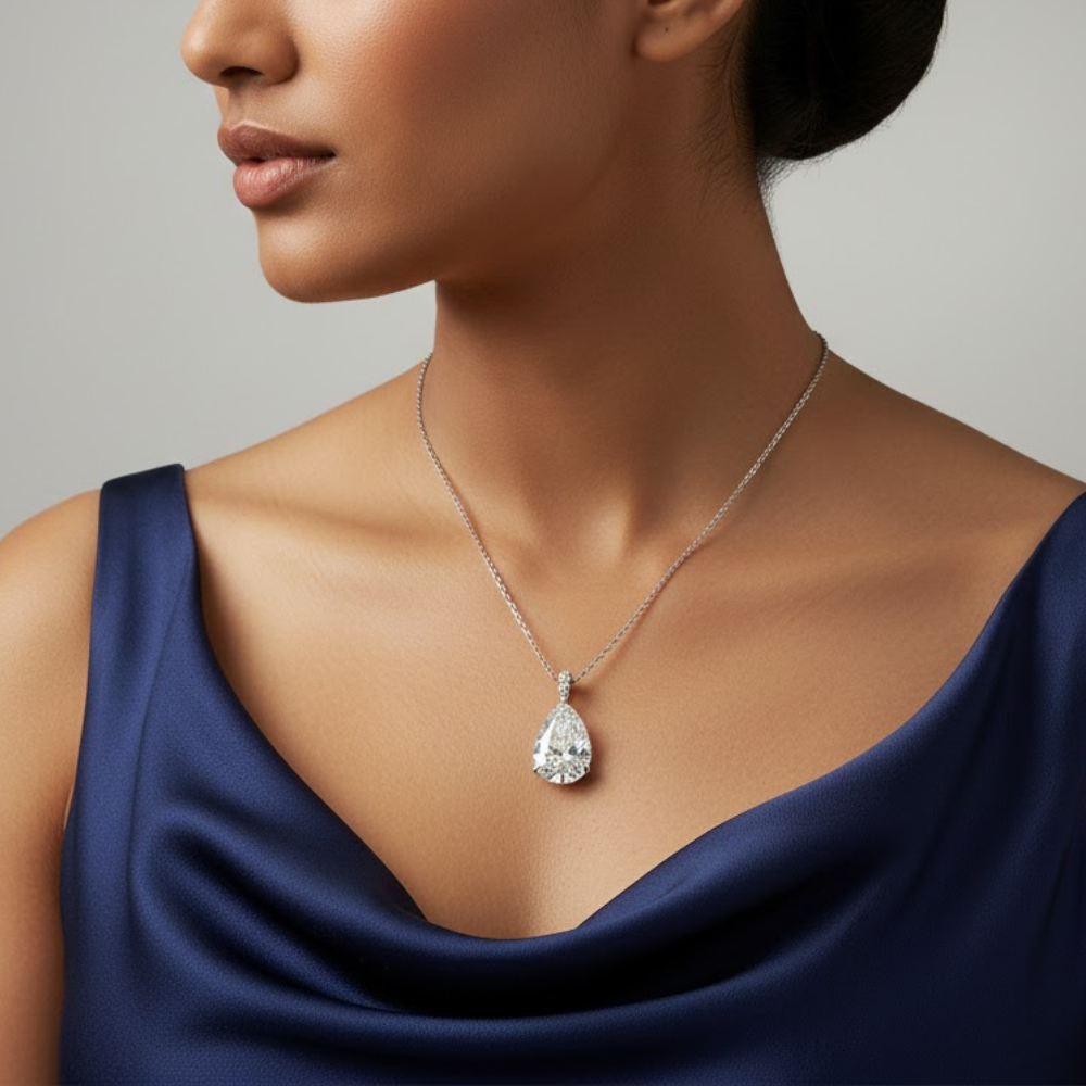The Celestine Pendant is a breathtaking masterpiece, embodying celestial grace and radiant brilliance. This magnificent pendant showcases a spectacular 3.4 Carat Pear Shape diamond, renowned for its elegant, elongated silhouette...