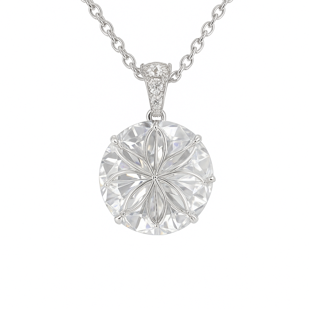 The Floral Rose Cut Diamond Pendant is an extraordinary piece, merging vintage allure with artistic brilliance. This captivating pendant showcases a magnificent 4.79 Carat artisan-cut diamond, featuring a unique rose-cut...
