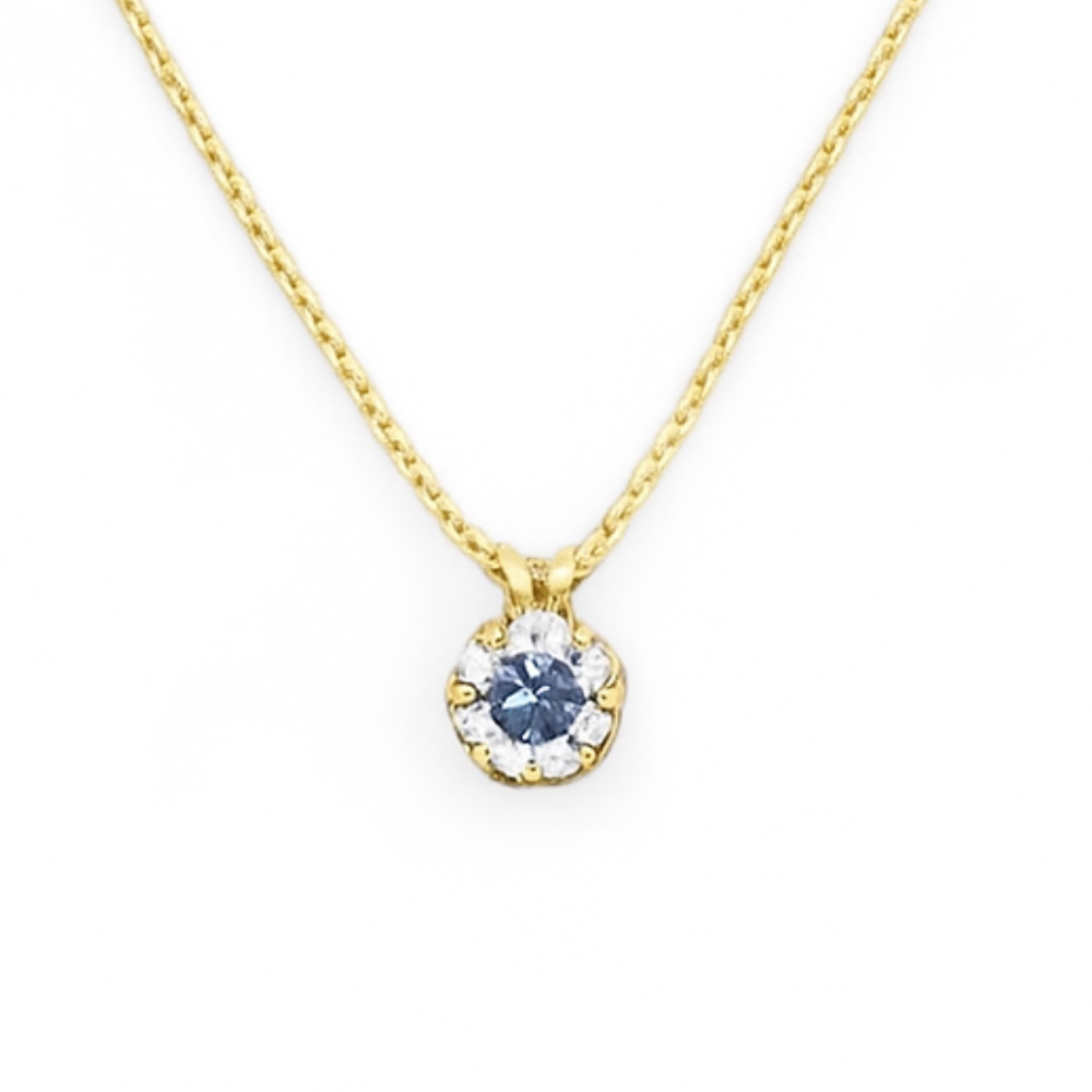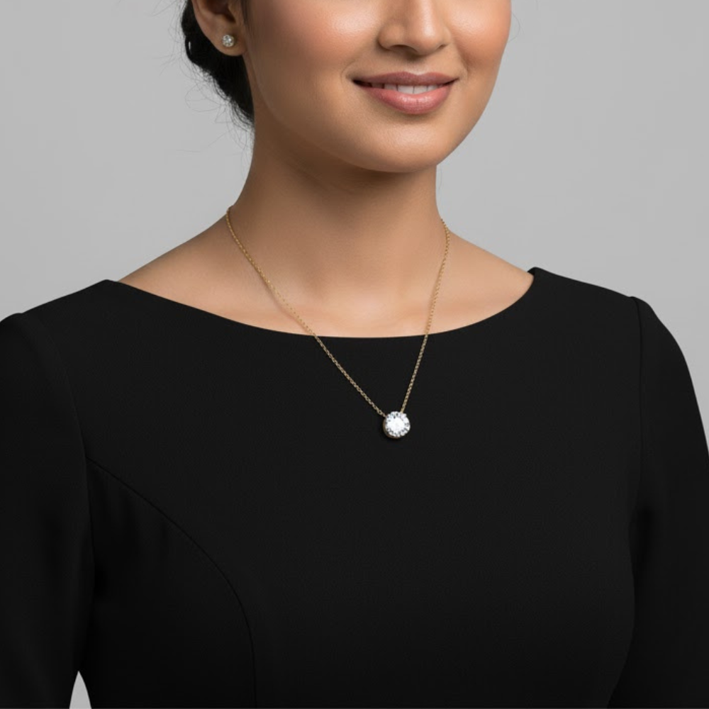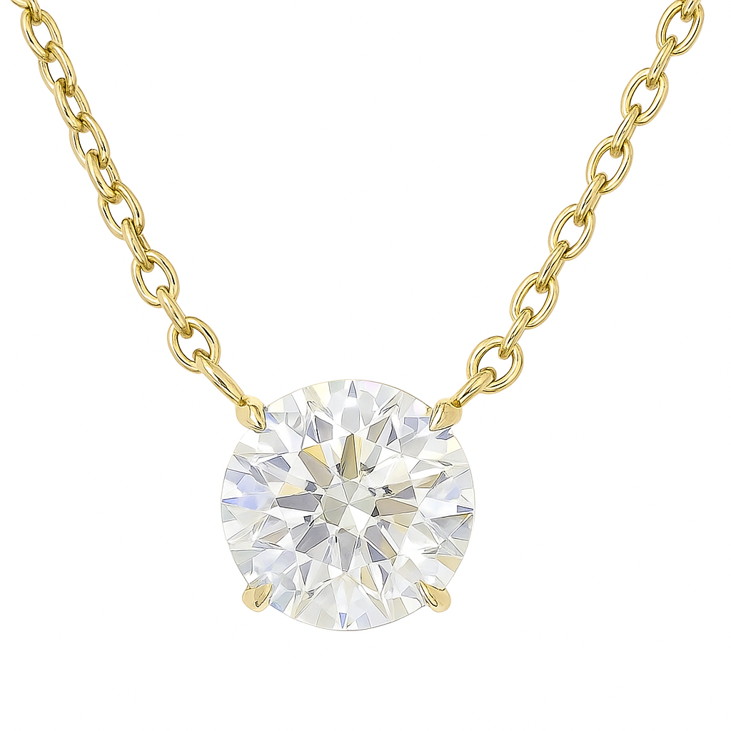 The Nyra Pendant features a magnificent 3.09 Carat Round Brilliant Diamond, universally loved for its unparalleled light return and breathtaking fire. Secured in a classic, warm 14K Yellow Gold Solitaire...