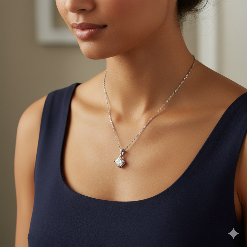The Zaria Pendant is a captivating piece that embodies modern sophistication and brilliant clarity. This striking pendant showcases a brilliant 2.83 Carat Princess Cut diamond, renowned for its exquisite square...