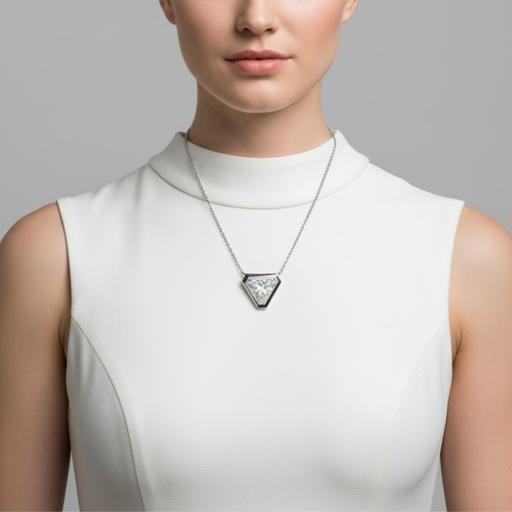 The Trigon Pendant is a captivating masterpiece, embodying bold geometry and sleek modernism. This exquisite pendant showcases a magnificent 2.05 Carat Triangle Shape (Trilliant) diamond, expertly secured in a minimalist...