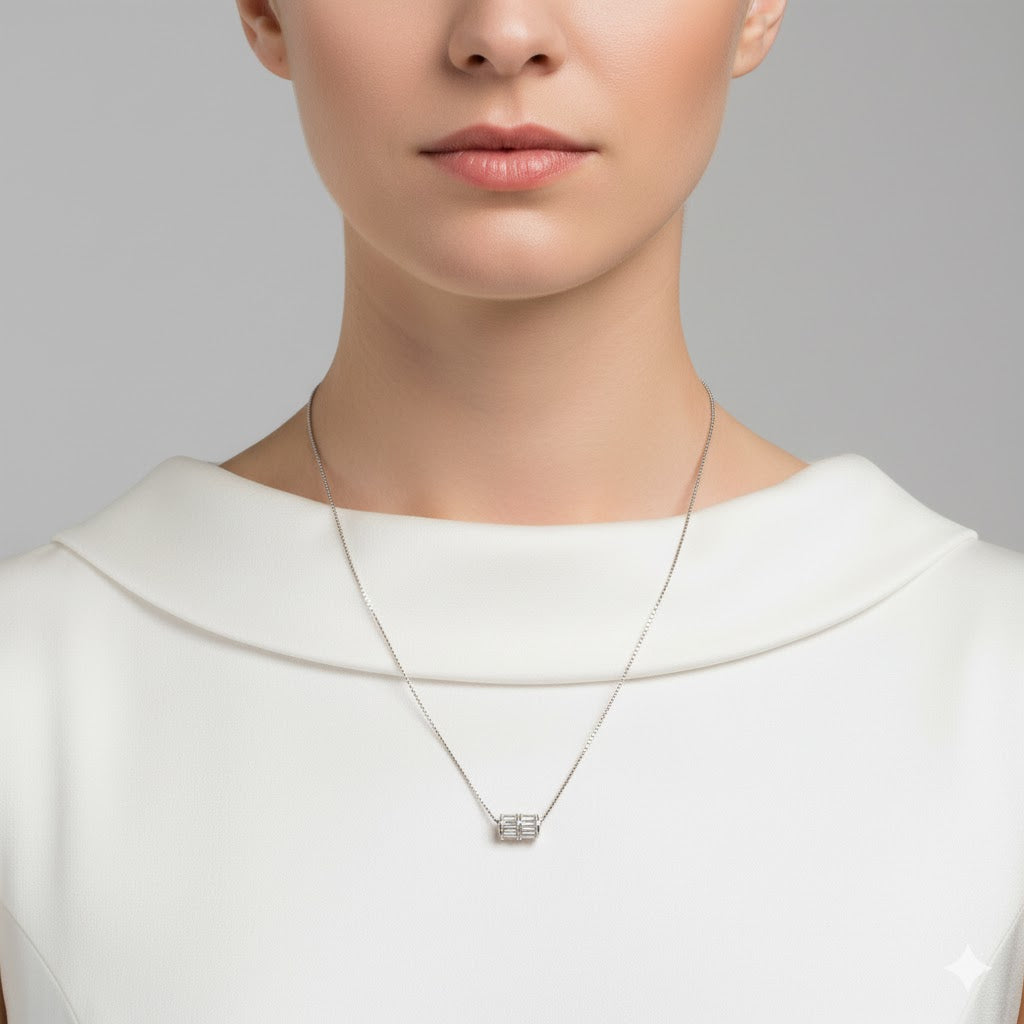 The Orpha Diamond Barrel Pendant is a captivating piece, designed to exude modern elegance and refined brilliance. This unique pendant features a total of 4.11 Carats of meticulously set Baguette...