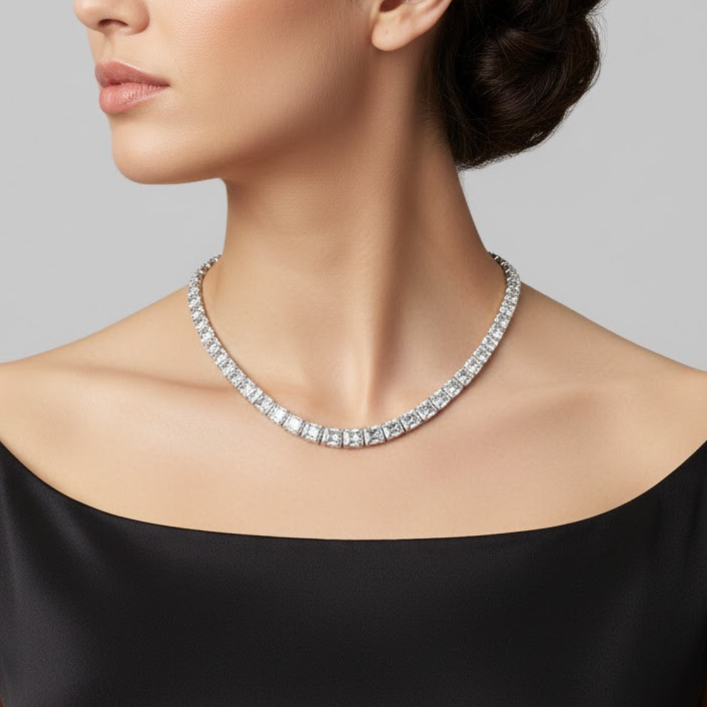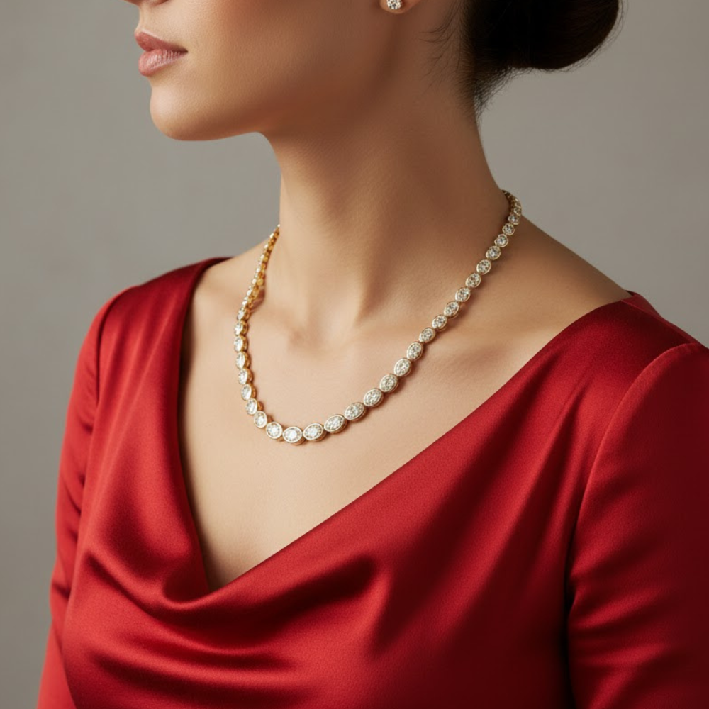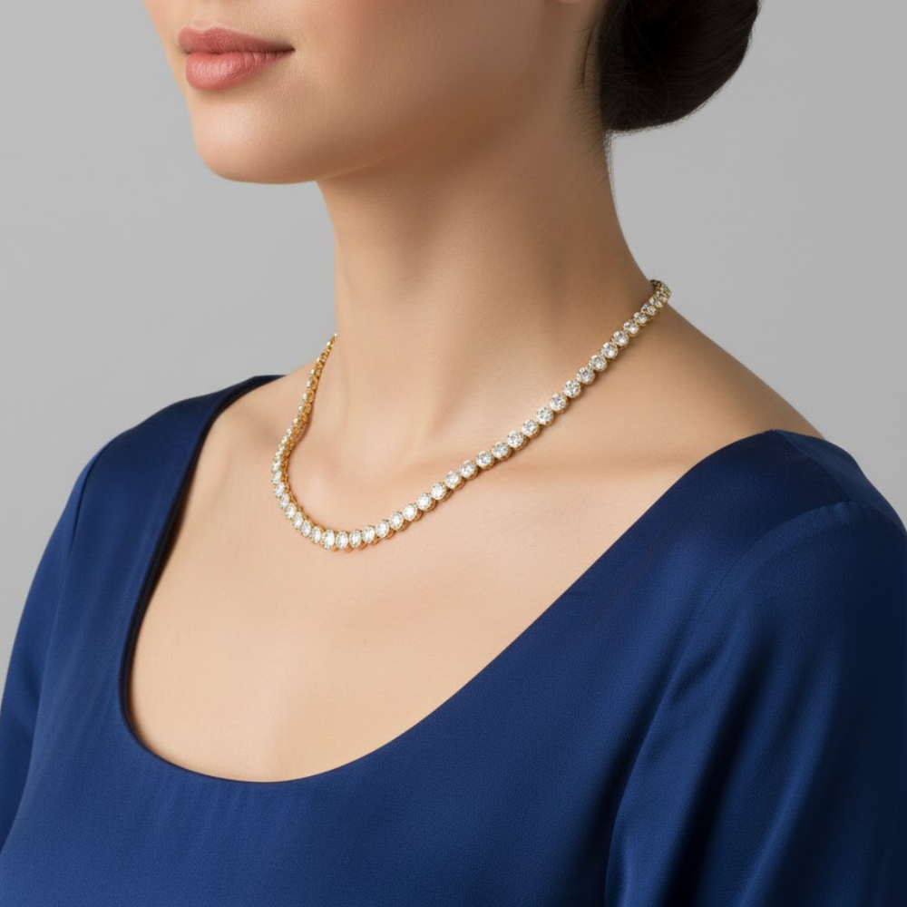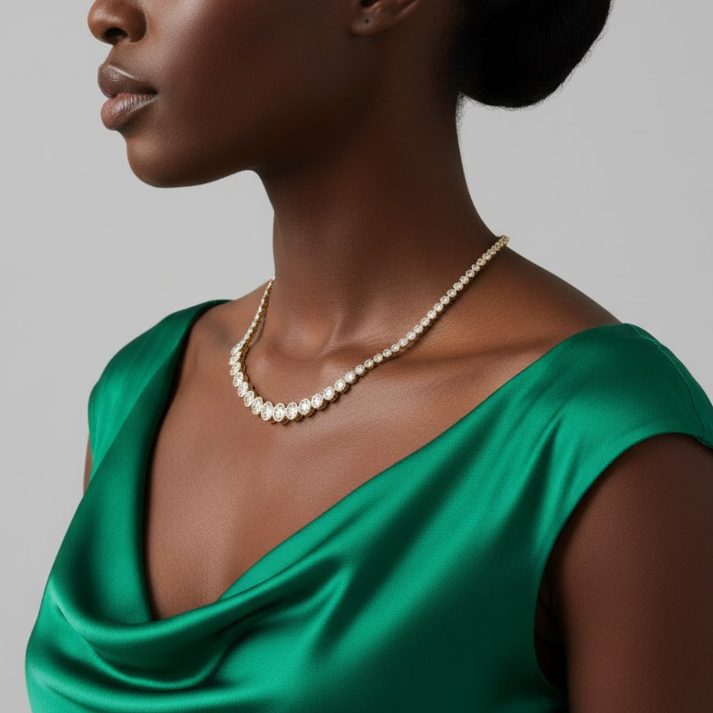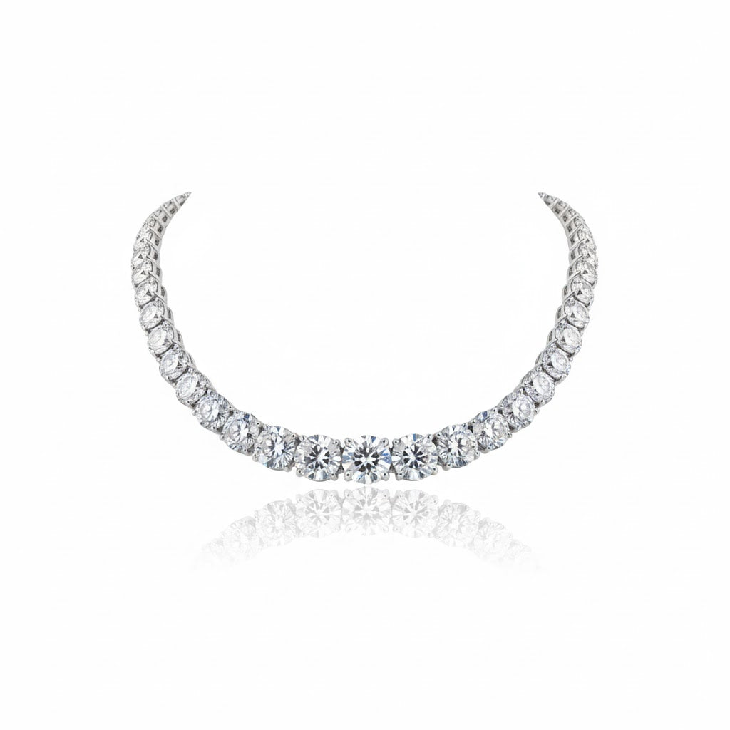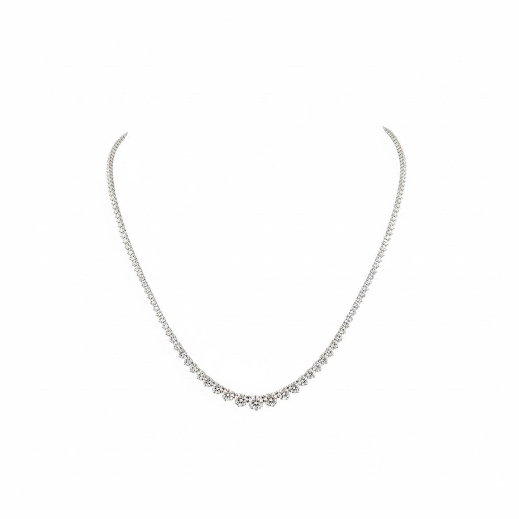 The Corinne Oval Diamond Riviera Necklace is a masterpiece of enduring elegance, designed to drape the neckline in continuous, spectacular sparkle. This magnificent piece features an impressive 12.33 Carat total...
