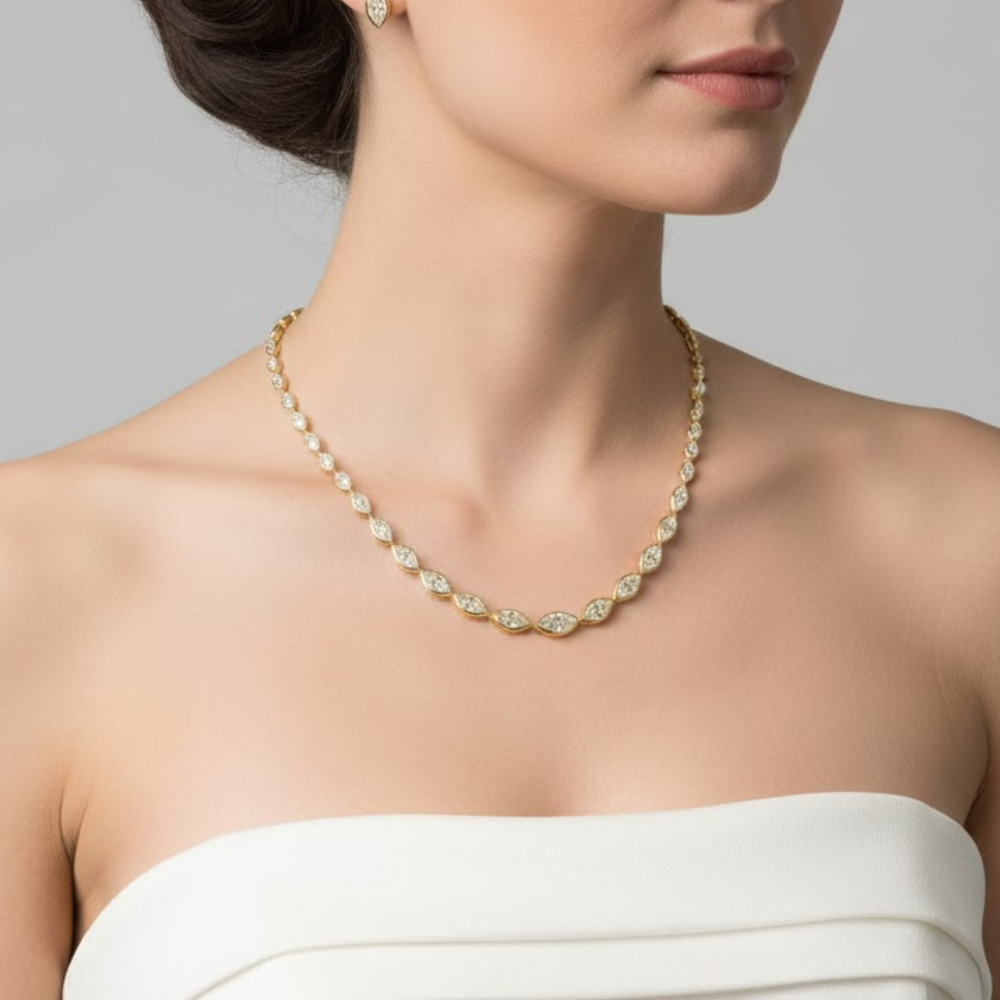 The Duchess Marque Marquise Diamond Riviera Necklace is a true symbol of regal elegance and sophisticated taste. This stunning piece features a total of 10.08 Carats of perfectly matched marquise...