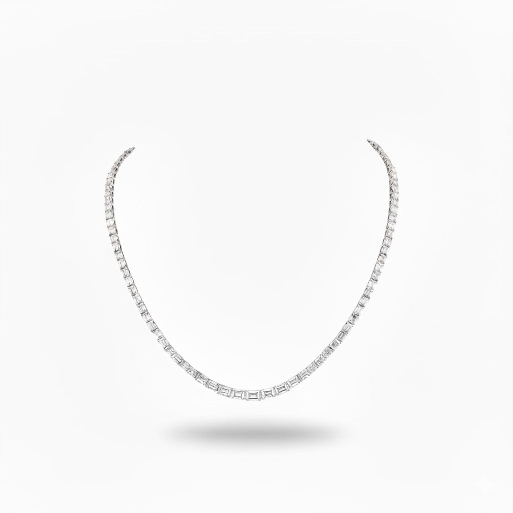 The Veridian Emerald Diamond Riviera Necklace is a masterpiece of refined, Art Deco elegance, designed to make a powerful yet sophisticated statement. This magnificent piece features an impressive 13.75 Carat...