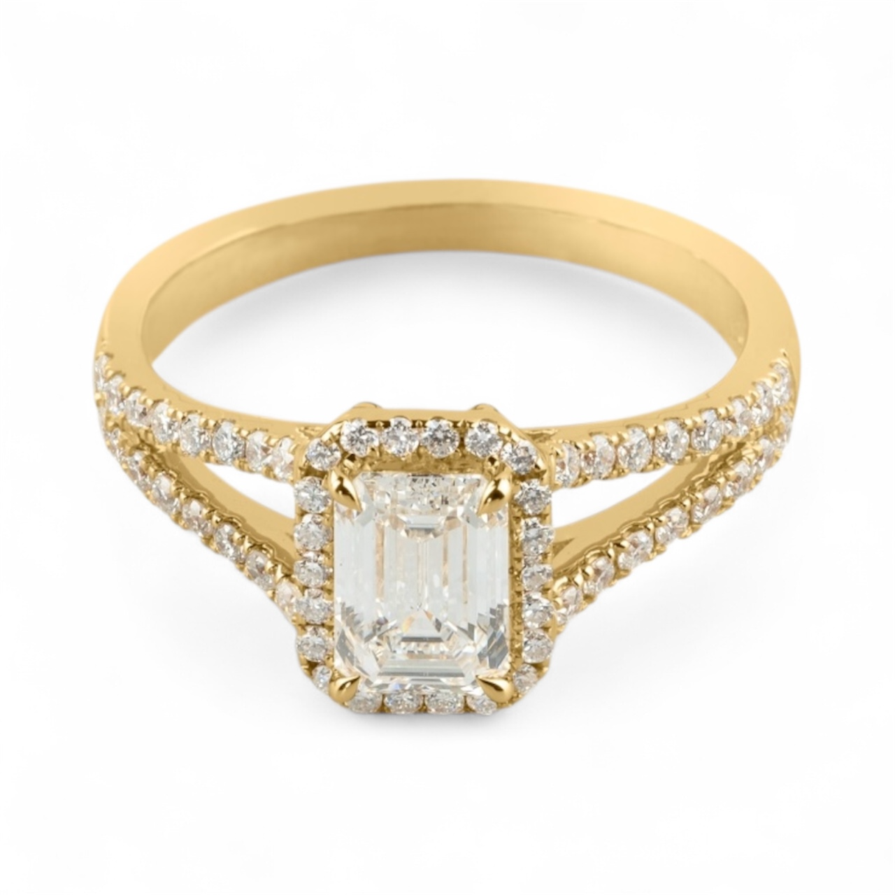 The Marlowe Emerald Cut Split Shank Ring in 14K Yellow Gold perfectly blends timeless elegance with modern refinement. This unique engagement ring features a magnificent Emerald Cut Diamond (approx. 2 Carats total weight), prized for its clean, geometric clarity and the striking "hall-of-mirrors" effect. The center stone is dramatically framed by a Split Shank band adorned with brilliant Pavé accents, enhancing the ring's overall sparkle and visual size. Expertly crafted in rich 14K YELLOW GOLD, the Marlowe Ring offers a unique style for those seeking geometric brilliance and a sophisticated, unforgettable engagement ring.